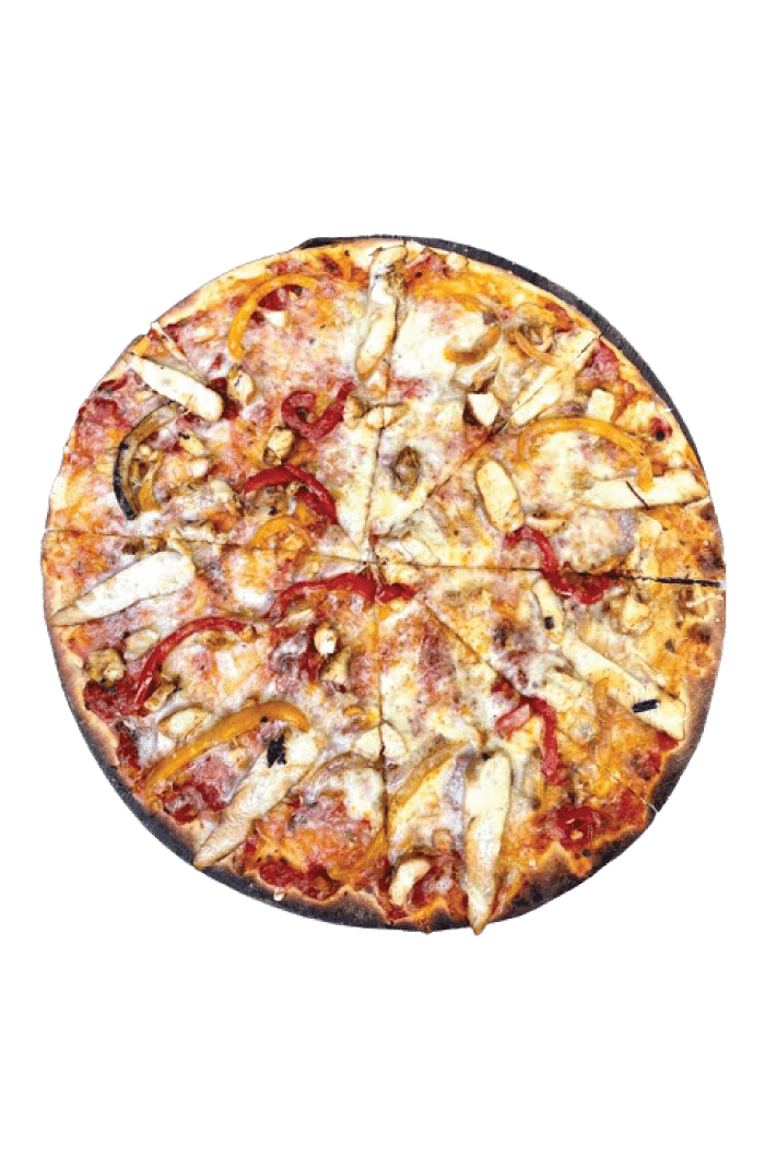 Mozzarella cheese, secret recipe tomato sauce, green pepper, onions, tomatoes, chicken and black olives.